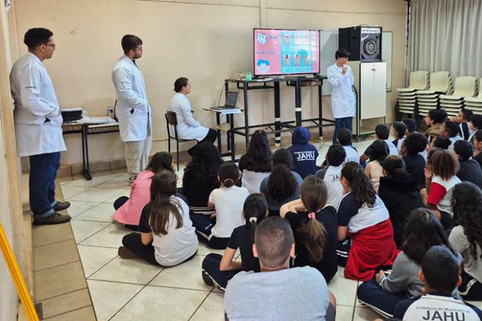 Promovendo saúde e educação, os alunos do 4º termo de Biomedicina da Unoeste desenvolveram uma ação de extensão sobre hábitos saudáveis na Escola Municipal de Ensino Fundamental (Emef) Comendador José Maria de Almeida Prado, no bairro Nova Jaú, em Jaú, nos dias 11 e 12 de novembro.