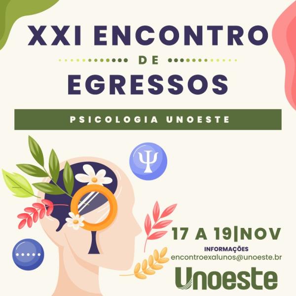 - O XXI Encontro de Egressos de Psicologia é um evento que visa compartilhar os trabalhos realizados por egressos do curso de Psicologia da UNOESTE, considerando suas inserções dentro das realidades e necessidades sociais. O evento tem como finalidade oportunizar a integração de ações científico-culturais visando o desenvolvimento de atividades complementares de extensão à comunidade acadêmica do curso de Psicologia, desenvolver conteúdos teóricos-técnicos, integrar a Comunidade discente do curso de Psicologia e os egressos.