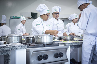 Cerca de 70% do curso é composto por aulas práticas, garantindo uma formação dinâmica e conectada ao mercado. Desde o início, você terá acesso a laboratórios equipados para aprender técnicas de cozinha, panificação, confeitaria, bebidas e gestão. A estrutura de ponta e o corpo docente experiente fazem toda a diferença para transformar sua paixão por culinária em uma carreira de sucesso.